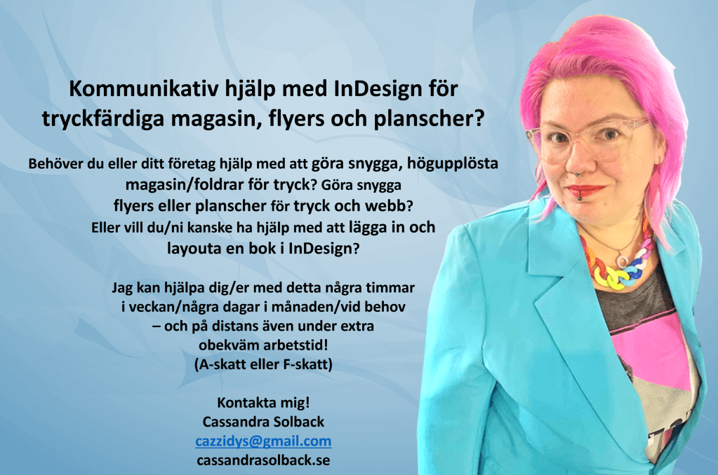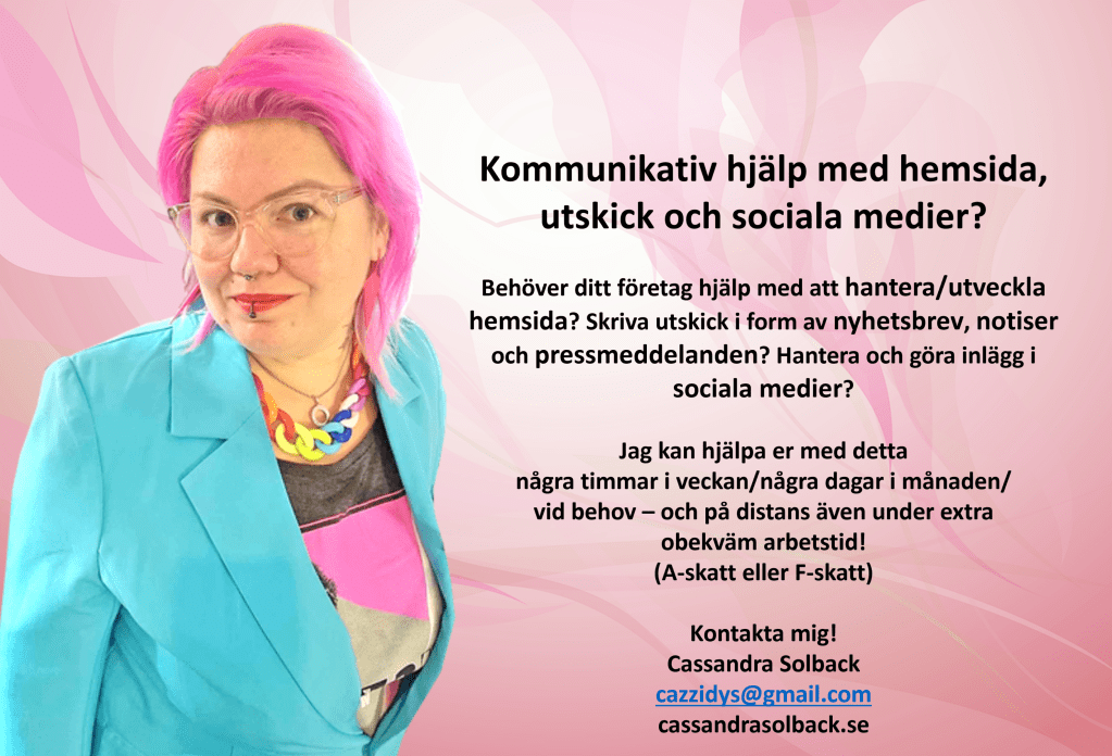 På denna sida kan du komma i kontakt med mitt företag Cazzidys AB, där du kan anlita mig som journalist, föreläsare, kurshandledare, kommunikatör, författare och illustratör!