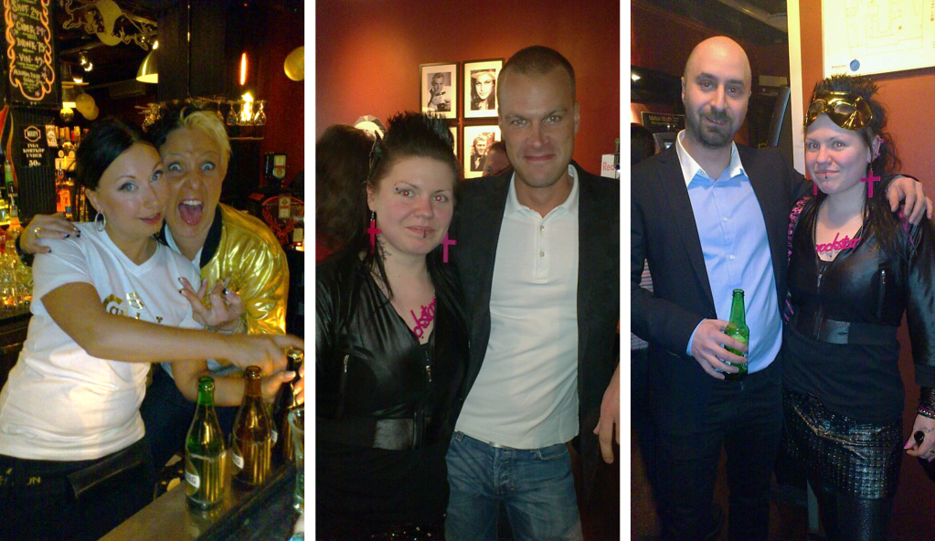 Personalen var finklädd. Jag blev jätteavis på Carolas snygga jacka i guld med Carlsberg-tryck på. De var kvällens sponsor. Dem anställda som var lediga var uppklädda och där privat;) Jag och min favoritbartender Simon, på bilden längst till höger, har alltid sagt att vi skall gifta oss med varandra om inte livet ter sig annorlunda för oss=P