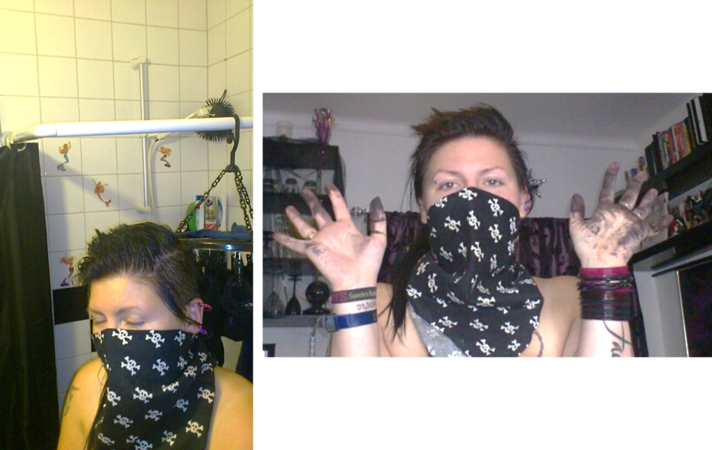 Innan jag började att spraya mitt löshår med svart färg, så färgade jag det. Det var tydligen inte så smart! Det stank som fan i hela huset! Plast och dessa kemikalier går nog inte ihop! Jag blev helt yr i huvudet, och orolig för Gregge! Min pojke blev orolig för mig och knöt vardagsrumsduken runt mitt ansikte!;)