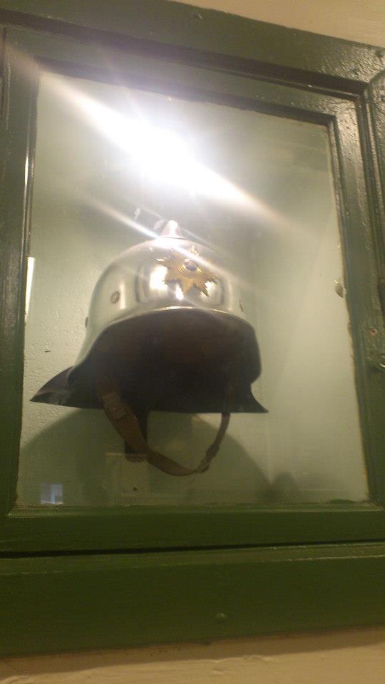Brandmännen hade gjort som ett lite muséfönster där de satt in en gammal brandhjälm. Den var riktigt fin, välputsad i plåt eller dylikt. Jag förstår att man sedan bytte ut den, då den måste ha blivit glödhet i bränder. Säkert även detta en sak som facket hjälpt till med att driva!;)