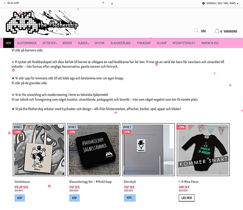 Mitt och Thobbes företag the Mothership har ny hemsida fylld av en hel del nya artiklar, som tex en fairtrade-tygkasse med barnens framtid och världsmotiv. Feministiska glasunderlägg i kork. Toadörr-skyltar för alla kön, babybody med kärlekstryck till alla föräldrar – oavsett om barnet har en mamma och en pappa, två pappor, två mammor eller andra päron. Och ännu fler coola affischer, under ämnena Feminism, Super Mario, Japan och Tokyo.