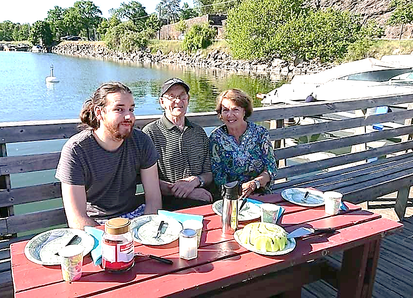 Denna bild är från farmors och farfars bostadsrättsförenings brygga ute i Saltsjöbaden, våren 2018 när farfar fyllde 85 år. Jag, Thobbe och farfars granne (till höger i bild) bestämde oss för att styra upp ett litet födelsedagsfika ute på bryggan. Detta var kort efter att farmor lämnat jordelivet. Efter ett tag kom det flera grannar dit, som bjöd på plockmat, frukt, vin och fina tal!