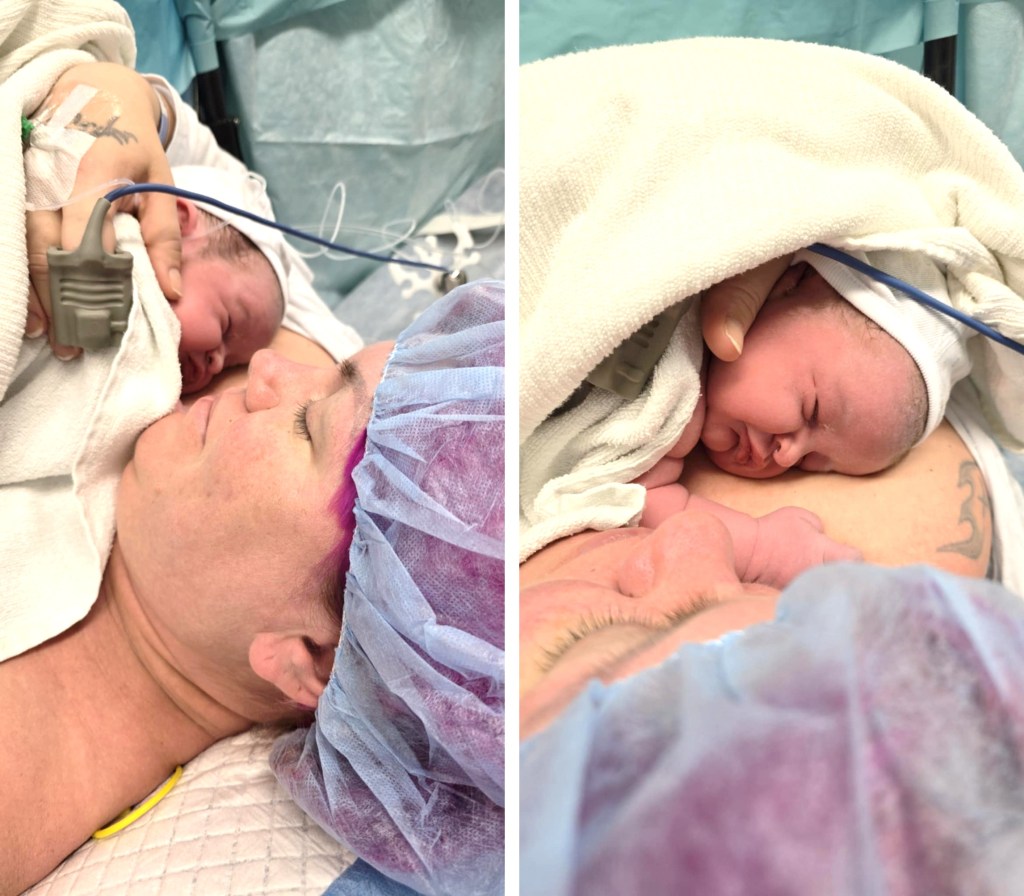 Så kom Äntligen Yumi till min famn. Jag vet inte vad som är standard vid en vaginal förlossning, men här frågar de om man vill ha barnet på bröstet eller ej vilket jag tycker är jättebra! Det är så mycket känslor i en under en förlossning! Jag längtade efter Yumi så jag sa Ja.