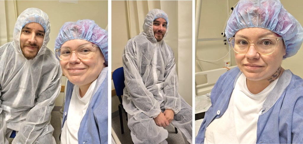I slussen in till operationssalen kollar de av smycken, dubbelkollar allergier, frågar om fastande och vätska samt ges möjlighet att lämna sina glasögon. Sedan är det dags för ryggbedövningen och jag får handsvett bara av att skriva det ordet!
