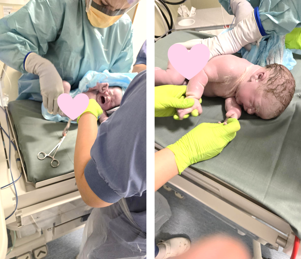 Ibland hör man lite skrik från andra sidan slussen där de tvättar rent, väger, mäter, klipper navelsträng och sätter på första blöjan. Här gavs även RS-vaccin, vilket är ny och tacksam rutin! Thobbe fick inte sätta på livets första blöja denna gång, men men.