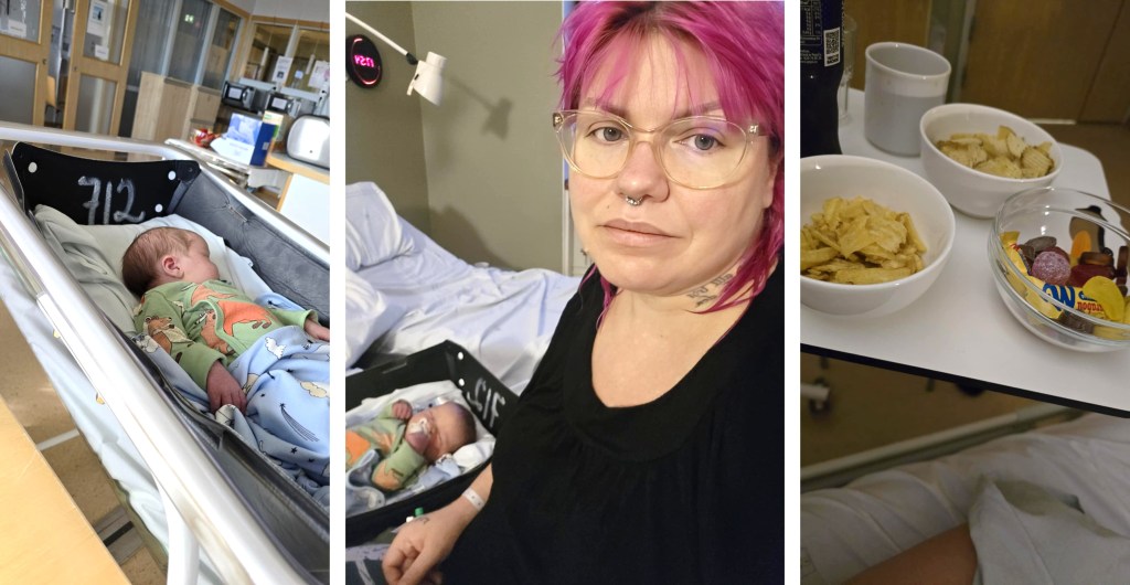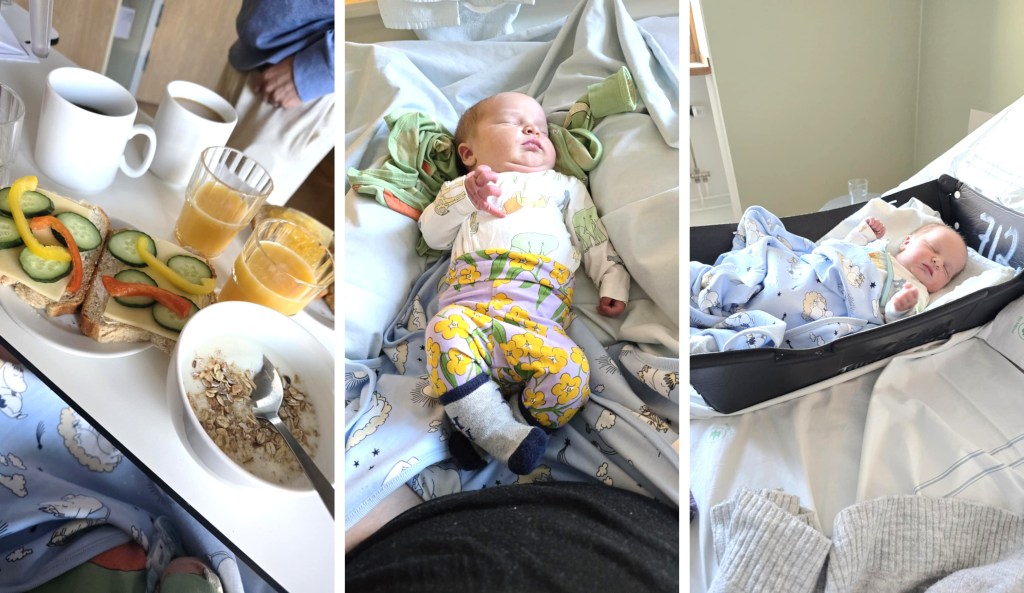 Här någonstans kommer jag på att Thobbe förmodligen inte åt någon frukost innan vi stack hemifrån – mycket riktigt, det hade han inte gjort. Tidigare har jag tvingat honom att göra det, även fast han tycker att det är orättvist mot mig som fastat sedan dagen innan. Men jag tycker att det är en grej att föda barn och en annan att sitta bredvid och då tycker jag att det är viktigt att han har ork att hjälpa och stötta mig när han gör detta. Nu klarade han ju det ändå, men han var ju vrålhungrig stackarn! Jag själv slutade att vara hungrig när det började bli dags för förlossning!