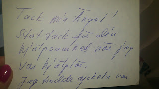 Jag gick in i vardagsrummet och bad min pojke att sätta blommorna i vatten. Sedan följde jag med kvinnan ut på innergården och hjälpte henne ut med cykeln. Jag bad henne att hälsa Maud att krya på sig, vi skakade hand och skildes sedan åt. När jag kom upp så skickade jag ett sms till Maud och tackade så mkt för de fina blommorna, och skrev att jag inte hade tagit emot pengarna. Då frågade hon mig om hon fick bjuda mig på middag när hon var frisk. Hon var sydd i huvudet och hade brutit bäckenbottenbenet. Jag gick ut i hallen för att hämta mitt snus i handväskan och såg då att kuvertet låg ovanpå väskan. Den unga kvinnan måste ha lagt det där medan jag gick in i vardagsrummet med blommorna. Jag öppnade kuvertet och i det låg ett kort och tusen spänn! Jag messade till Maud och skrev att den unga kvinnan, som var hennes kollega, hade lagt kuvertet på min handväska utan att jag visste om det, och att jag inte kunde ta emot pengarna. Hon ringde då upp och sa att det var det minsta hon kunde göra då cykeln kostade 7000kr, var oförsäkrad och att hon var i stort behov av en cykel. Hon vägrade att ta tillbaka pengarna och gjorde verkligen allt för att jag skulle förstå hur hon menade och känna mig värdig dem. Sedan så pratade vi lite om olyckan, som hon inte minns, och la sedan på. Jag har fortfarande dåligt samvete för det här med pengarna och funderar på att skicka tackblommor!