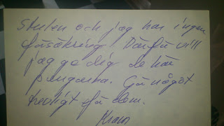 Dagen efter så hade jag ett meddelande på min mobil när jag gick på lunch, på jobbet. Det var en Maud som ringde och var överlycklig över att jag hade hennes cykel, och skulle skicka någon senare under dagen som skulle hämta cykeln. Problemet var bara att cykeln var borta! Två timmar efter att jag hade mailat till polisen så försvann cykeln! Jag tänkte att antingen så hade de listat ut vem kvinnan var och hon hade kommit och hämtat den, eller så hade de själva hämtat den, då jag hade bett dem att ta hand om den om de inte kunde lista ut vem kvinnan var. Så när jag senare ringde upp Maud så frågade jag om meddelandet kanske hade spelats in dagen innan, men att mobilen hade fuckat upp sig och registrerat det dagen efter, eftersom cykeln var borta. För hade polisen hämtat den så hade det ju meddelat Maud det då de fick tag på henne. Men så var det inte, utan meddelandet hade spelats in på onsdag morgon, och hon hade inte hämtat cykeln. Jag lovade Maud att leta så fort jag hade kommit hem, och om jag inte skulle hitta den så skulle jag sätta upp lappar, och prata med styrelsen i min förening. Jag tyckte det var riktigt pinsamt, och vad var oddsen att den nu skulle ha blivit snodd, när jag äntligen hade fått kontakt med kvinnan?! Jag bestämde mig för att leta runt i kvarteret, och om jag inte skulle hitta den så skulle jag, förutom att sätta upp lappar och prata med styrelsen, förhöra folk som jobbar runt omkring min port, och anmäla stöld. Men jag hoppades på att någon i styrelsen hade flyttat på cykeln iom brandsäkerheten, och antingen ställt den i källarn eller på innergården. Men jag tyckte att de då i sånna fall borde ha lämnat en lapp i min box och meddelat mig detta. Jag hade skrivit under lappen på pakethållaren med mitt namn, och jag hade kollat i min box så fort att jag upptäckte att cykeln var borta. Jag skyndade mig hem, gick av bussen en hållplats tidigare, för att slippa sitta fast i slussen och förlora tid på det. Och så höll jag utkik till höger och vänster, medan jag vandrade upp på min gata. När jag kom fram till mitt hus, så kollade jag först i min box om det nu låg någon lapp där, men där fans bara räkningar. Sedan kollade jag i soprummet, men där fanns bara sopor. Och sedan gick jag ut på innergården, och där stod den!!!=) Jag ringde till Maud och berättade att cykeln stod på min innergård, och hon blev överlycklig än en gång! Hon sa att hon skulle skicka en kvinna för att hämta den, och en timme senare så ringde det på dörren. Där stod en ung kvinna i början av 30-årsåldern, med en stor bukett blommor i ena handen, och ett kuvert i andra handen. Jag tackade så mkt för blommorna som var en riktigt fin bukett! Men kuvertet vägrade jag att ta emot då hon sa att det låg pengar i det. Hon försökte övertala mig en stund, men jag sa att det var mer än väl med så fina blommor.