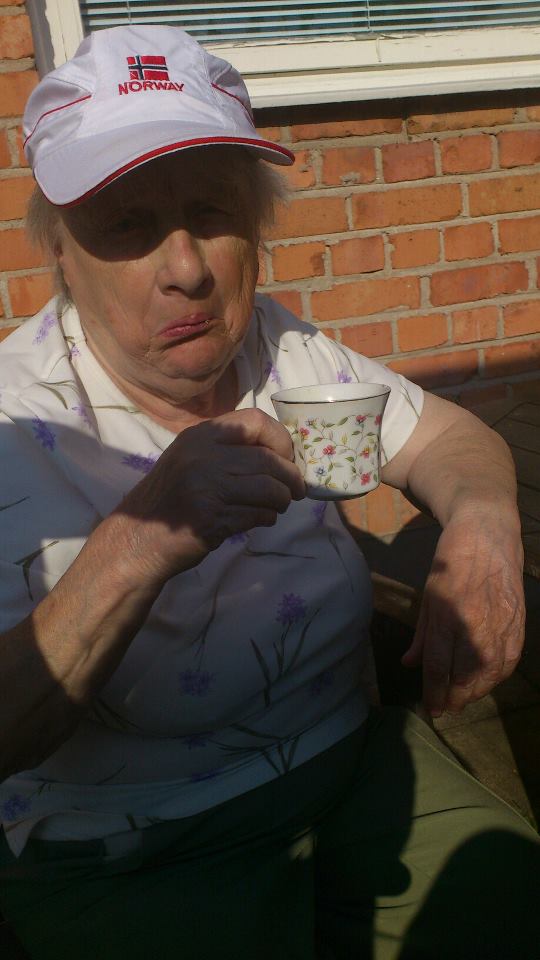 Idag var jag hemma hos henne. Hon har lovat att ta det lugnt tills på torsdag iaf. Idag så drack vi kaffe, tittade på gamla foton, pratade om hennes tid som fackombud, pratade politik, och om kungafamiljen.