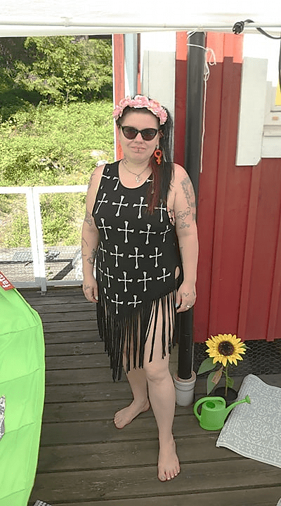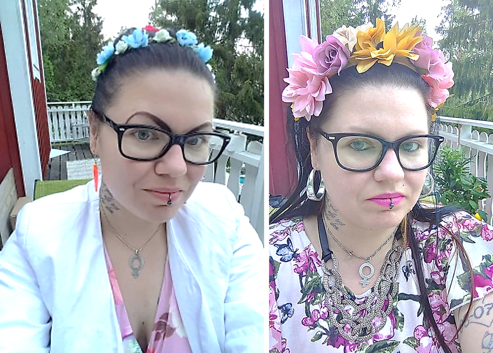 Här till höger är jag under årets midsommaraftonsmiddag och till vänster under förra årets midsommaraftonsmiddag – man ser hur man utvecklats stilmässigt!;) Tyckte förra årets klänning var färgglad och väldigt blommig men den är ju ingenting mot i år och både årets blommor och glasögon är större!;)