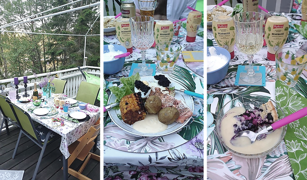 På midsommar så grillar vi alltid – faktum är att vi gör det som oftast när vi är på landet!;) Hemma i stan grillar vi aldrig, det har väl blivit 2-3 gånger totalt där vi bor nu (vi flyttade in i det huset år 2013) – förmodligen för att vi stör oss så mycket på grillen vars rök kommer rakt in i lägenheten så vi är inte särskilt förtjusta i att folk grillar på vår minimala innergård så känns liksom dumt att då själva stå där och elda på! I år var det alltså jag, Thobbe och Jiro till bordet och det blev som vanligt lax för mig och Jiro och kött för Thobbe, färskpotatis med dill, grillad majskolv, ägghalvor med tångkaviar och sås. Skumpa för mig, öl för Thobbe och saft för Jiro. Årets efterrätt blev färdigköpt – blåbärspaj med vaniljsås!;)