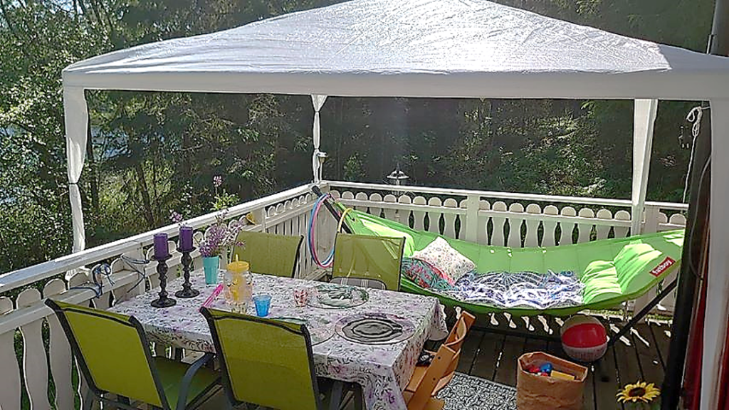 På lördagen byggde vi sedan upp vårt lilla familjecamp eller vad vi skall kalla det för!;) Det blir sjukt varmt på altanen om dagarna så för att kunna hänga där så behövs ett tak – funkar perfekt med partytält. Att sedan ligga i hängmattan och njuta av livet är något jag verkligen älskar att göra här ute – samtidigt som Jiro sitter på golvet och leker!;)