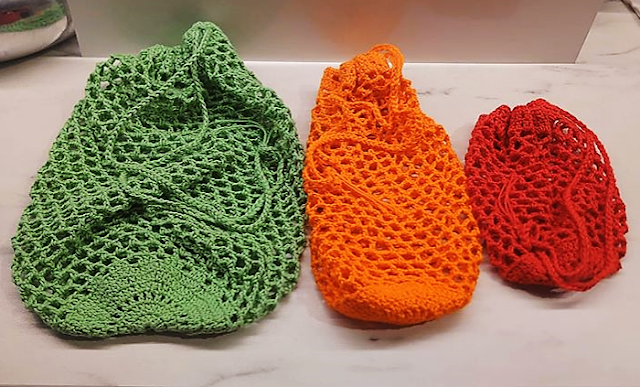 En nyhet är våra virkade grönsaks- och fruktpåsar i färger från växtriket, som man då lägger sitt frukt- och grönt i när man handlar, istället för att köpa engångs-plastpåsar som nu även dem kostar pengar.