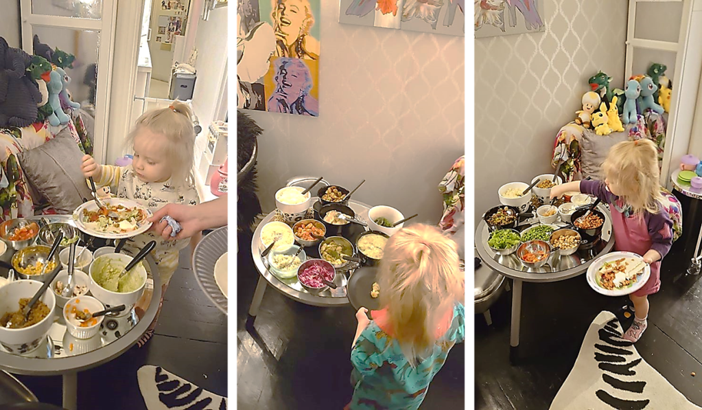 Att äta mycket och massor av olika grönsaker och bönor är vardag för oss och Jiro älskar detta! Han blir extra glad när vi dukar upp buffé på hans lilla bord i vardagsrummet och själv får plocka ihop till sin tallrik. Jag säger inte att vi på något sätt är bättre än de som dagligen äter kött – det är nämligen något som man ofta får höra när man säger att man äter vegetariskt – trots att man inte ”attackerat” köttätaren i rummet. Jag tycker snarare att väldigt många som äter kött är väldigt duktiga på att attackera oss som inte äter kött! Ofta får man höra saker som (och då extra ofta när man pratar om barns kost) ”Men nu får han i sig all näring han behöver?”, ”Barn behöver kött och mjölk när de växer!” precis som om det vore supernyttigt och extremt näringsrikt att äta en massa slafs och senrester som korv och köttbullar och annan gammal svensk husmanskost innehåller. Där finns på något sätt en tro om att denna mat innehåller någon slags magisk och livsnödvändig köttprotein och att det räcker alldeles utmärkt med att endast äta isbergssallad, tomat och gurka som grönsaker – typisk grillkiosk-sallad med 95 procent vatten. Hum. Och så den viktiga komjölken på det. ”Ja men det är ju inte gott att dricka havredryck!”. Vi dricker inte växtbaserad dryck till maten, varför skulle vi göra det? Komjölken vi växt upp med, drack man ju för att man trodde att det var livsavgörande medans man växte. Den växtbaserade mjölken är ju istället för komjölk och den använder vi i mat, till Oboy och Thobbe som inte dricker svart kaffe har den i kaffet. Till maten dricker vi vatten (en otroligt viktig och underskattad dryck!) eller juice! På samma sätt kan man bli attackerad när man inte ger sitt barn så kallat ”riktigt godis”! Vi dömer inte dem som ger barn godis gjort av gelatin och socker, men Jiros lördagsgodis består av fruktgodis, majsbågar och popcorn och han ÄLSKAR det! Här kan man få höra saker som ”Men jag tror att det är bra att ge barnen socker tidigt så att de liksom vänjer sig och inte får en extrem chock senare i livet!”. Jiro kommer hinna äta godis med ”riktigt socker” i, jag lovar! Men jag tror knappast att det är skadligt att han får vänta med det i några år! Ju äldre han blir desto fler kalas lär det bli och sedan blir det till slut oundvikligt. Slutligen – vi vet alla att vi äter på tok för mycket kött i världen och att köttkonsumtionen aldrig varit så stor och brutal som den är nu för tiden! Detta har en extrem miljöpåverkan och skapar även bakterier som kan vara riktigt farliga (kolla bara på vad vi befinner oss i just nu!) så att alla måste äta mindre kött är ett faktum. Sedan så har vi något i Sverige som kallas för BVC – det är frivilligt men gratis och går man där så behöver man aldrig oroa sig för sina barns värden och hur man växer! En sista tanke kan ju också vara varför så många försöker att få sina barn att till exempel äta broccoli, om nu korven är det nyttigaste?;)
