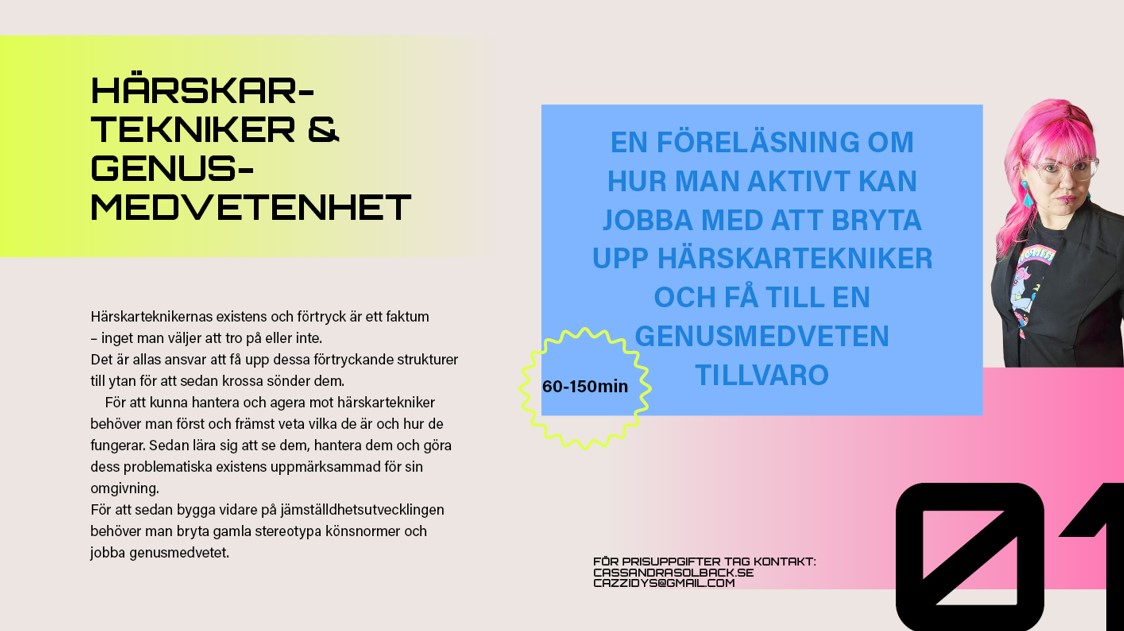 De områden jag har särskild kunskap inom är härskartekniker, feminism, genusmedvetenhet, allas lika värde och rätt, mobbning och utanförskap, ideal och kroppshets, självskadebeteende, arbetarrörelsen i stort, demokrati, den svenska modellen, fackpolitiskt, normkritik, kvinnohistoria och normer, ideologier, att kommunicera och organisera.