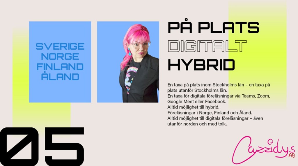 Jag föreläser på plats och hybrid i Sverige, Norge, Finland och på Åland. Självklart kör jag också digitalt och även utanför norden, samt med tolk.